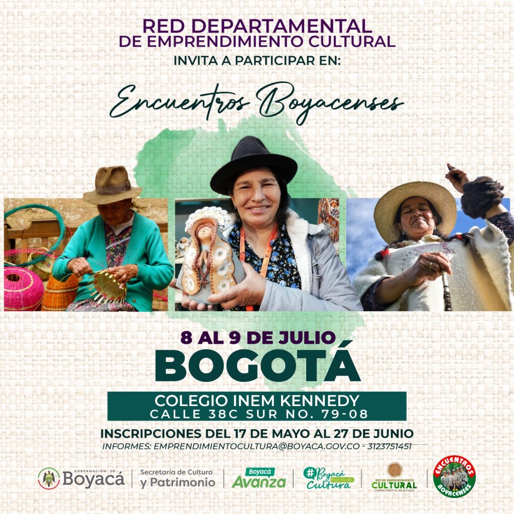 Tunja, 17 de mayo de 2023. (UACP). La Gobernación de Boyacá por medio de la Secretaría de Cultura y Patrimonio, invita a participar en la muestra de emprendimientos culturales, una alianza con el evento denominado Encuentros Boyacenses, los días 8 y 9 de julio próximo en el Colegio Inem de Kennedy, en la ciudad de Bogotá.